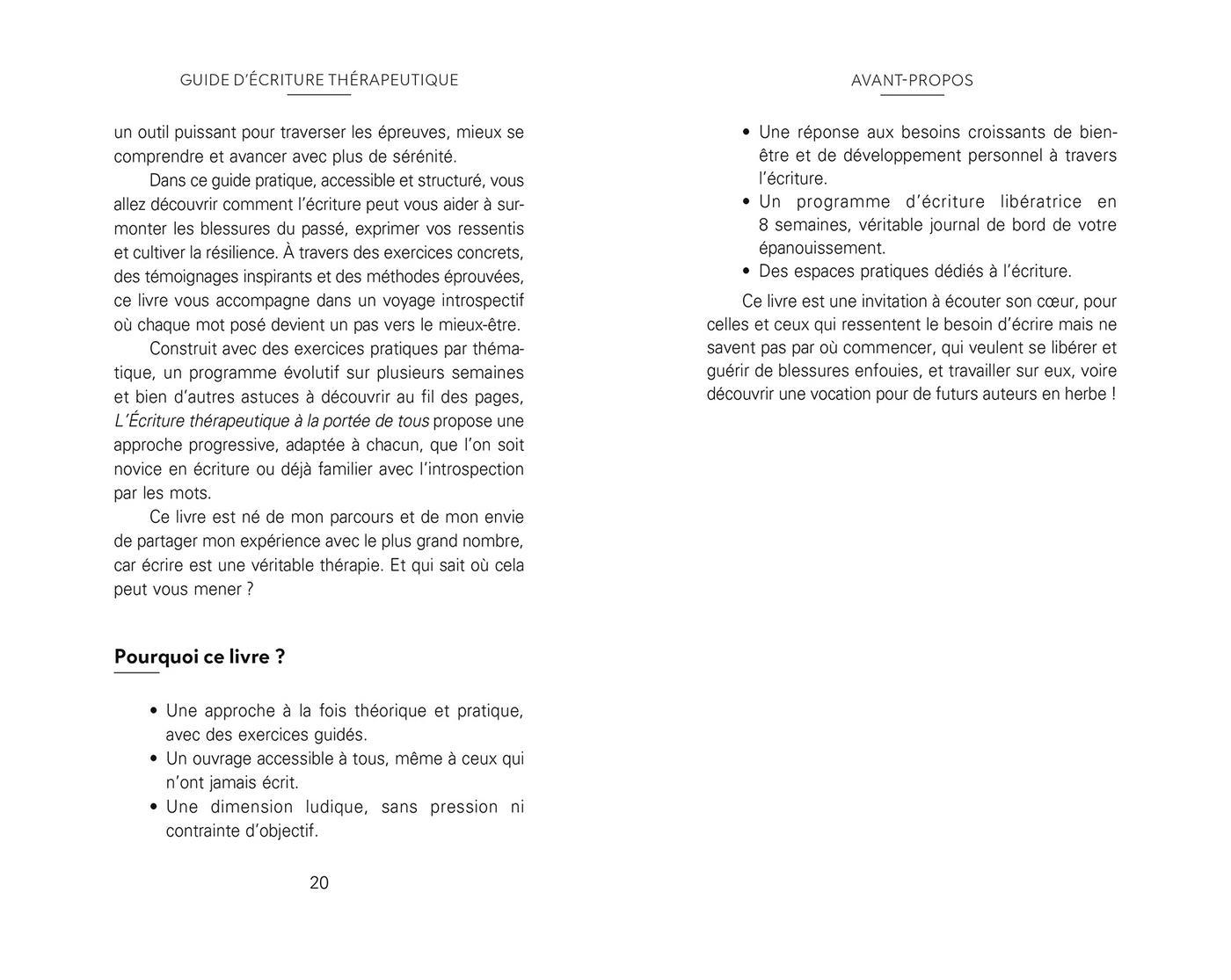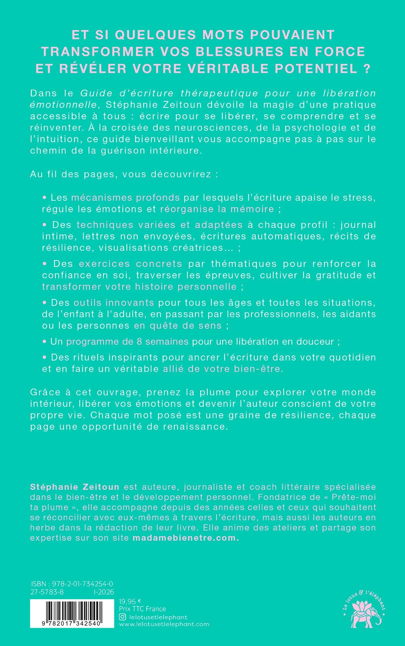 Dans le Guide d’écriture thérapeutique pour une libération émotionnelle, Stéphanie Zeitoun dévoile la magie d’une pratique accessible à tous : écrire pour se libérer, se comprendre et se réinventer. À la croisée des neurosciences, de la psychologie et de l ’ intuition, ce guide bienveillant vous accompagne pas à pas sur le chemin de la guérison intérieure.